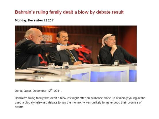 Particularly, the Doha Debates held a controversial debate which challenged the very government of the country it was held in: “This House has no confidence in Bahrain’s promise to reform” held on 12 December 2011 led to an end vote that resulted in a victory for the anti-government motion!