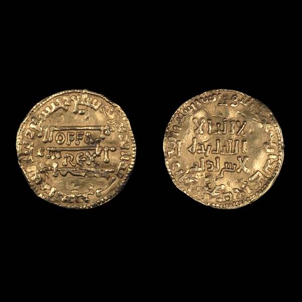 This unique gold coin of Offa, king of Mercia, is one of the most remarkable English coins of the Middle Ages. It is remarkable because it imitates a gold dinar of the caliph al-Mansur, ruler of the Islamic Abbasid dynasty. Although the Arabic inscription is not copied perfectly, it is close enough that it is clear that the original from which it was copied was struck in the Islamic year AH 157 (AD 773-74). It seems that the engraver had no understanding of the Arabic script: the name and title OFFA REX has been inserted upside down in relation to the Arabic inscription.
