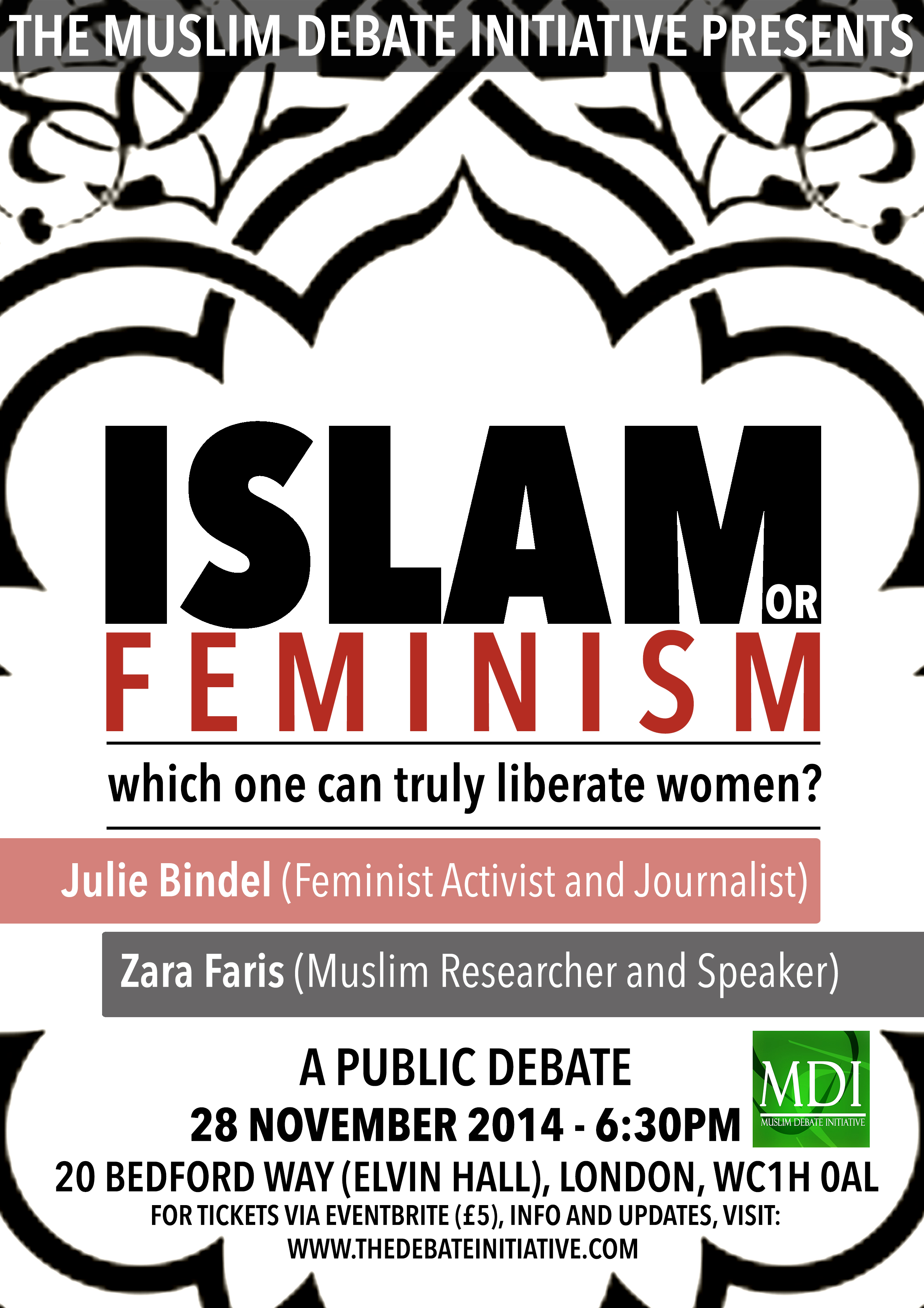The Muslim Debate Initiative is excited to announce that Zara Faris (Muslim Researcher and Speaker) will be debating Julie Bindel (journalist and activist) on the question, “Islam or Feminism: which one can truly liberate women?”